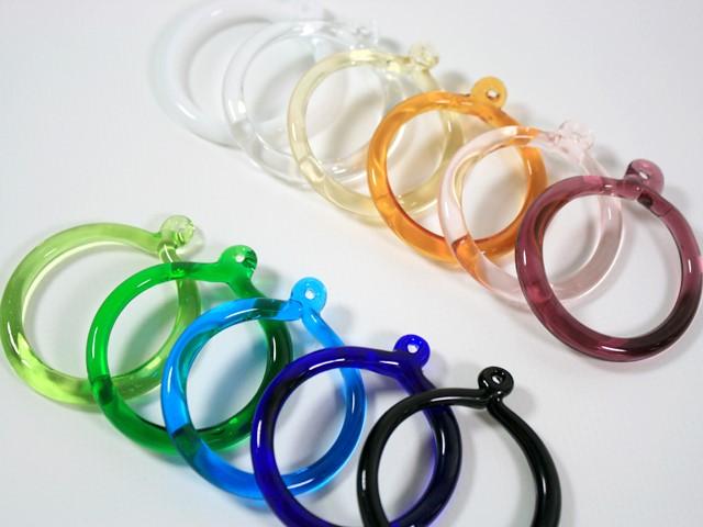 Anello pendente in vetro di Murano fatto a mano, colore in fogo. Ogni anello misura circa 50 mm in diametro (sono realizzati a mano e non a stampo). Ogni pendente è dotato di foro passante in sommità, per consentire un rapido aggancio.