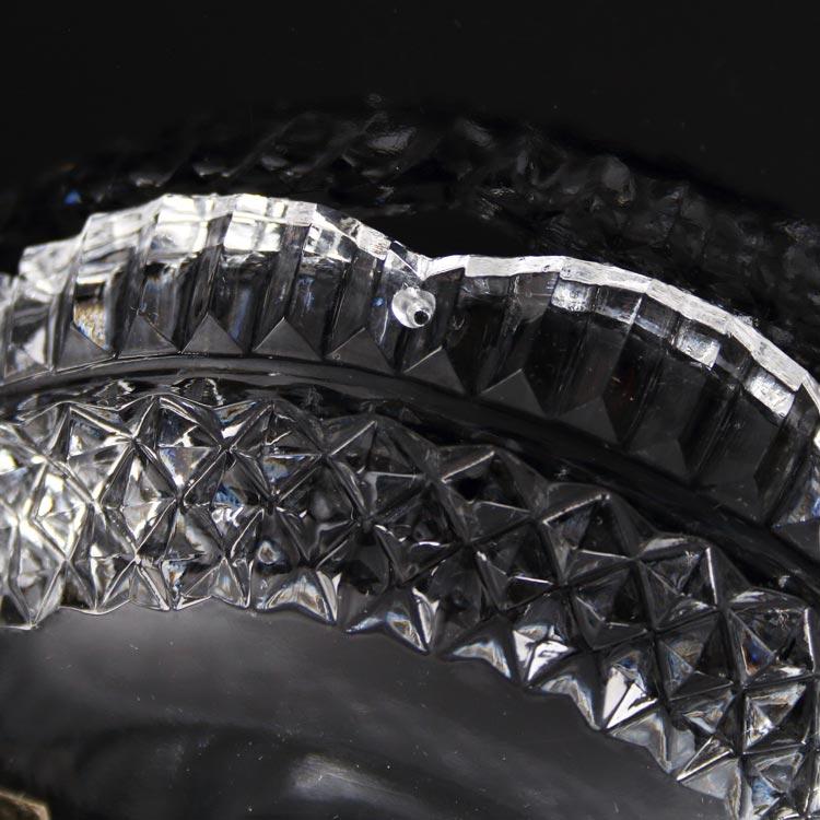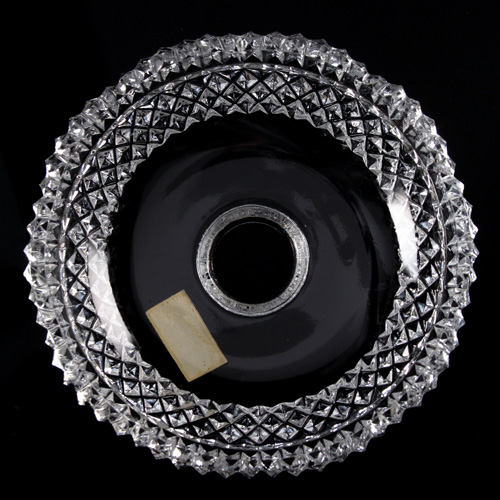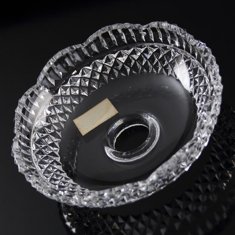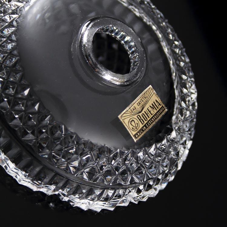 Bobeche o coppa in cristallo di Boemia diametro massimo Ø15 cm, foro Ø2,3 cm altezza della tazza 30 mm. Ai lati sono presenti 5 fori, pensati per l'inserimento di pendenti, strenne o catene di cristalli che abbelliscono la composizione.