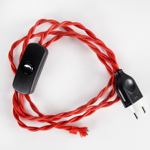 Cablaggio con cavo in tessuto rosso intrecciato sezione 2x0,5. Provvisto di interuttore e spina colore nero per restaurare lampade e abat-jour o creare punti luce con un nuovo look.