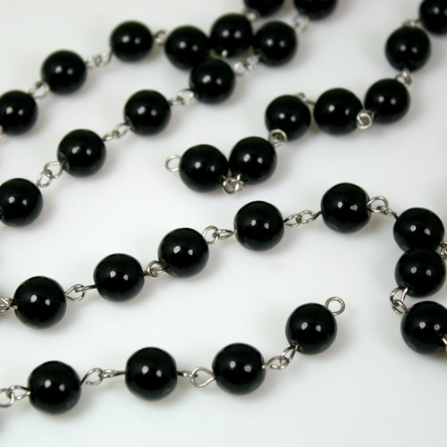 Catena da 100 cm perle di vetro nere, realizzata con tondini da 10 mm in vetro veneziano, connesse mediante spilli a occhiello color nickel.