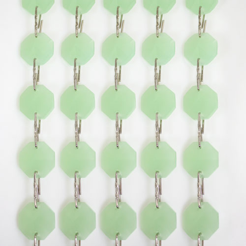 Brillante catena di ottagoni in cristallo molato, dal diametro 14 mm e lunghezza 50 cm. La catena in oggetto è realizzata con connettori a clip "stella" nikel; consulta il nostro catalogo o contattaci per finiture differenti.