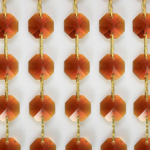 Brillante catena di ottagoni in cristallo molato colore ambra, dal diametro 18 mm e lunghezza 50 cm. La catena in oggetto è realizzata con connettori a clip "stella" colore nickel; consulta il nostro catalogo o contattaci per finiture differenti.