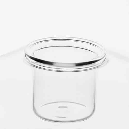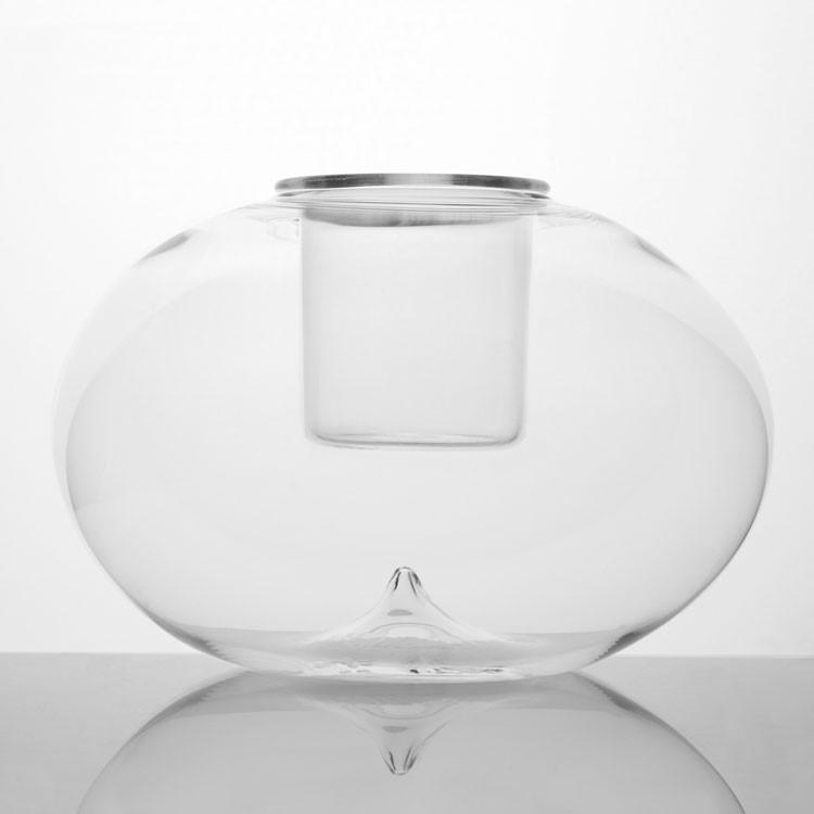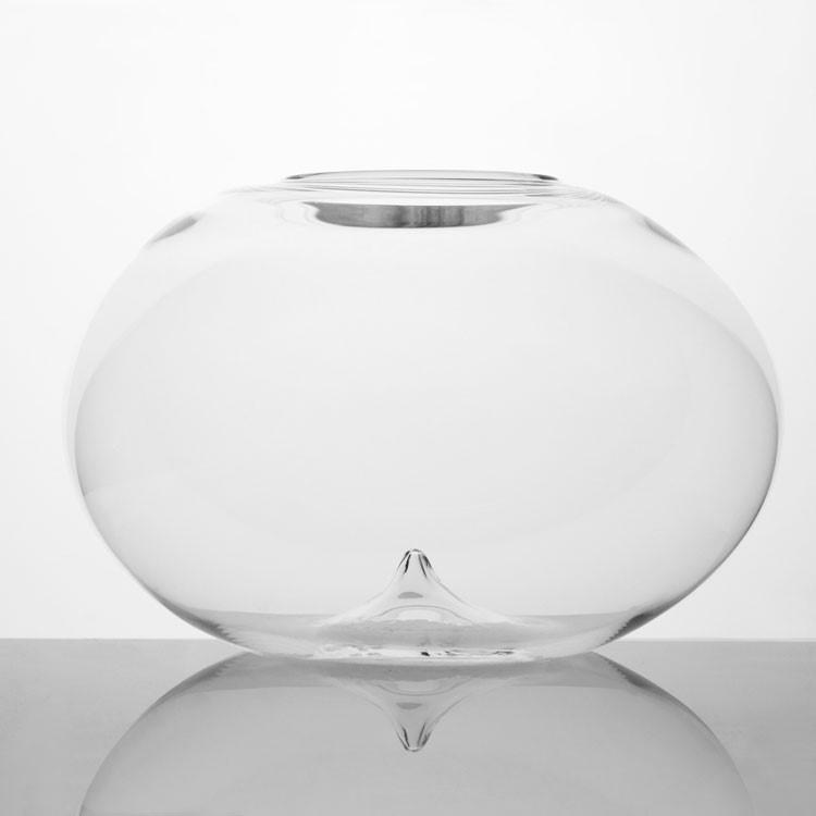 Vaso in vetro cristallo trasparente Ø18 cm con bicchierino interno estraibile. La forma è quella di una sfera schiacciata, caratterizzata da un foro nella parte superiore. Il vaso a sfera ospita un bicchierino in vetro estraibile in cui si possono inserire candele telight o piante di piccole dimensioni.
