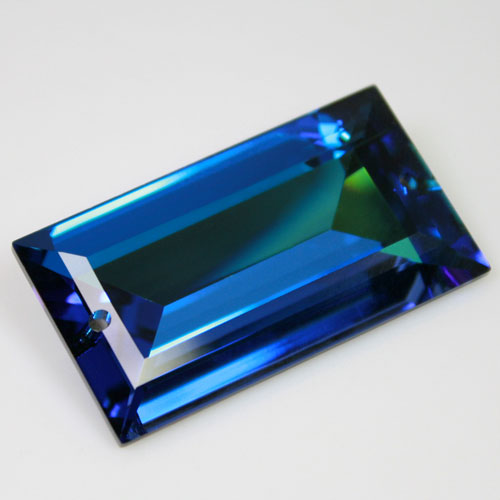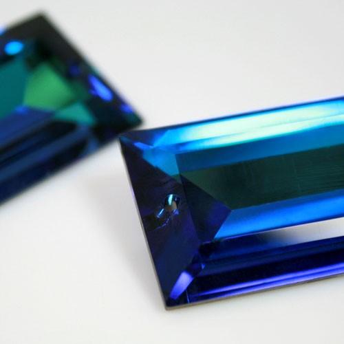 Swarovski losanga taglio baguette 40x22 mm blue petrolio con riflessi iridati, che sfumano nel colore viola, nel lilla e nel verde in base alla luce che li colpisce.