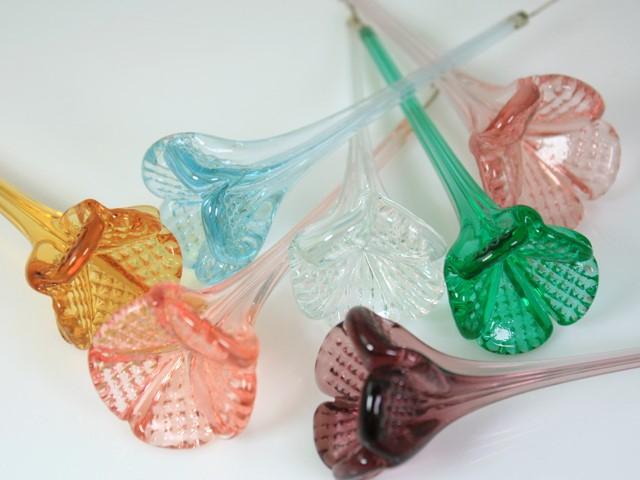 Magnifico fiore artigianale in vetro artistico di Murano, colorato in fogo. Ogni fiore misura circa 12 centimetri in altezza (un fiore non è mai uguale all'altro, sono tutti fatti a mano) ed è dotato di apposito gancio a filo d'ottone, già installato nella parte superiore della stesso.