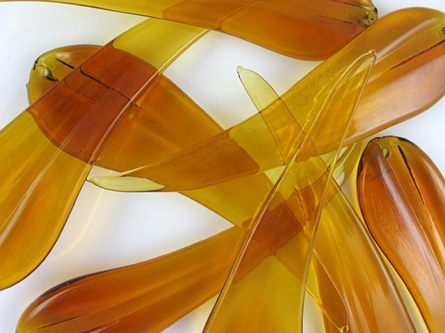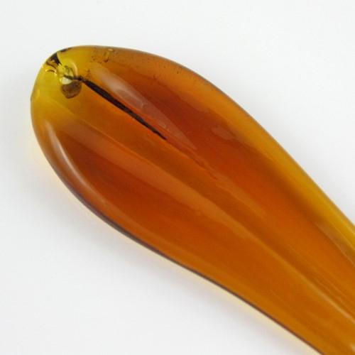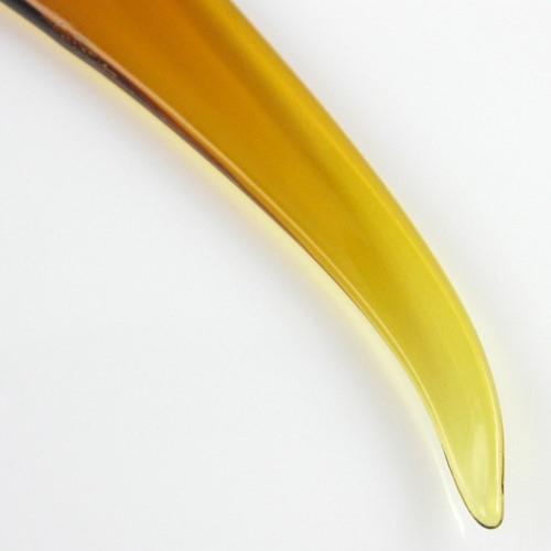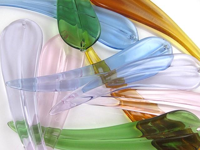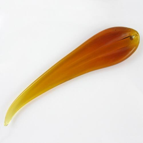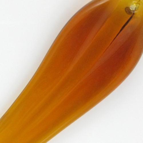Pendaglio sagomato a forma di foglia piatta lunga pendente, liscia, con misure di 12x3 cm circa, in vetro colorato.
