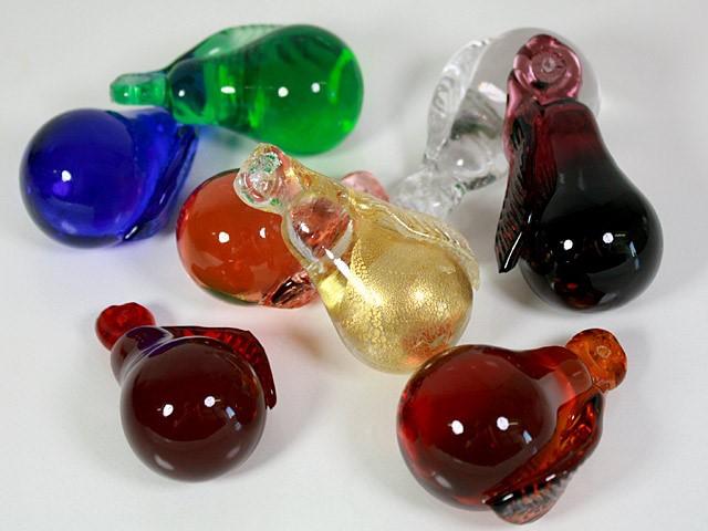 Pendagli a forma di frutta, artigianali in vetro di Murano. Ogni frutto misura dai 5 ai 7 cm circa in altezza. Sono creazioni realizzate a mano e non a stampo, seguendo i crismi della produzione muranese, pertanto non ne esistono due identici. Il "color in fogo" garantisce inalterabilità ed eccezionali effetti di luce e colore.