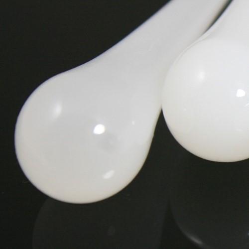 Goccia da 100 mm (dieci centimetri) in vetro di Murano color bianco seta in fuoco. Il "color in fuoco" garantisce colori inalterabili e luminosita' superiori, a differenza di tutti gli elementi, di minor qualita', che vengono colorati a freddo mediante verniciatura esterna. Tali gocce sono tipiche della produzione per lampadari in vetro di Murano, con essi si possono allestire non solo articoli da illuminazione, ma anche composizioni di grande effetto come addobbi, monili e intere installazioni.Ogni goccia e' provvista di un tondino d'ottone immerso in sommità, per consentire un rapido e resistente aggancio della goccia a qualsiasi struttura.