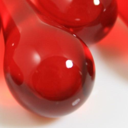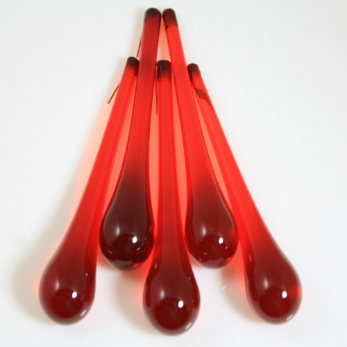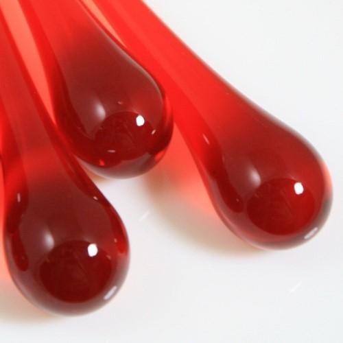 Goccia da 100 mm (dieci centimetri) in vetro di Murano color rosso in fuoco. Il "color in fuoco" garantisce colori inalterabili e luminosita' superiori, a differenza di tutti gli elementi, di minor qualita', che vengono colorati a freddo mediante verniciatura esterna.Tali gocce sono tipiche della produzione per lampadari in vetro di Murano, con essi si possono allestire non solo articoli da illuminazione, ma anche composizioni di grande effetto come addobbi, monili e intere installazioni.Ogni goccia e' provvista di un tondino d'ottone immerso in sommità, per consentire un rapido e resistente aggancio della goccia a qualsiasi struttura.