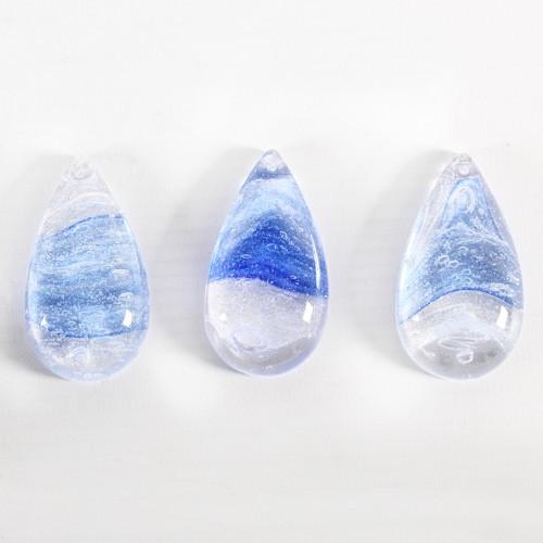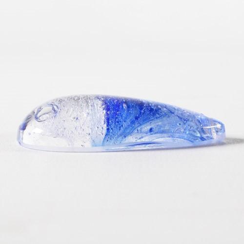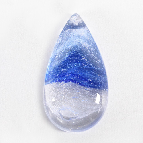 Pendaglio liscio altezza 50 mm in vetro colore cristallo con effetto "bulicante" cristallo di rocca e variegato in blue. La particolare forma è detta "mezzo fico" poiché si presenta come una mandorla liscia con la base piatta. Gemma con foro in sommità per l'inserimento di spillo, clip o gancio metallico (disponibili nell'apposita sezione dello store dedicato a “Agganci, clip e minuterie”).