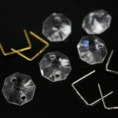 Ogni elemento è dotato di doppio foro per l'inserimento della clip o gancetto necessari per creare catene di cristalli, tende, lampadari, cascate, etc... (sezione dedicata ad agganci, clip, spilli e minuterie).
