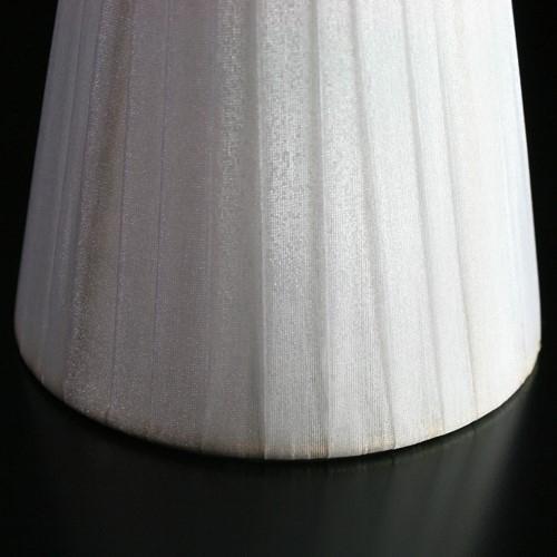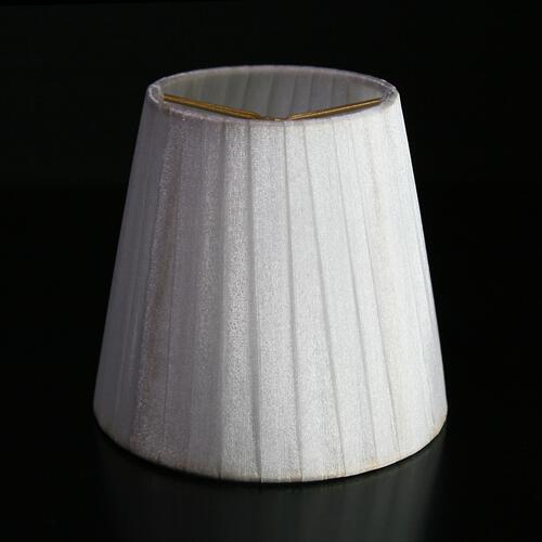 Paralume tronco cono con attacco universale a molletta. Il paralume è artigianale e ha telaio color oro, rivestito in materiale Velo Siena (organza) nastrato color bianco.