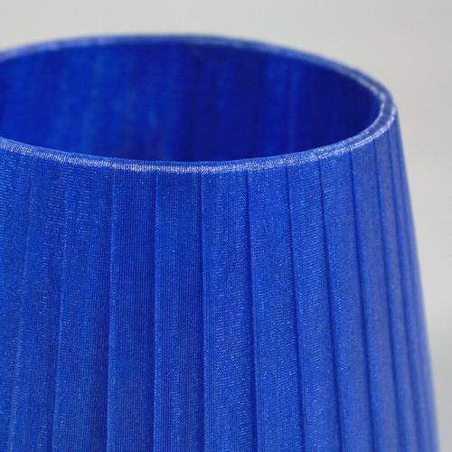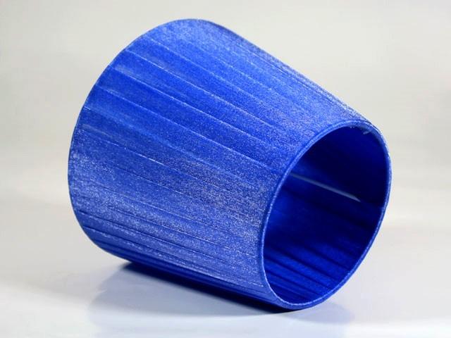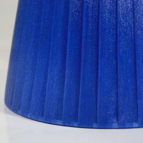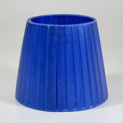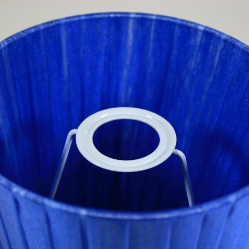 Paralume artigianale tronco cono con attacco standard E14. Il paralume ha telaio color bianco, rivestito in materiale Velo Siena (organza) nastrato color blue intenso.