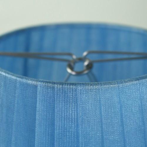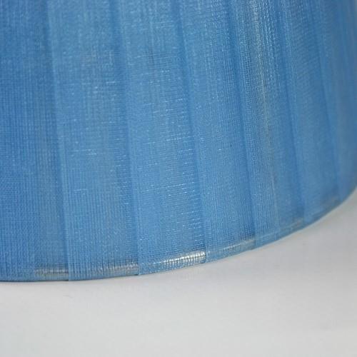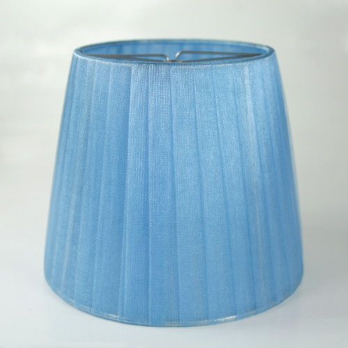 Paralume tronco conico rivestito da velo organza celeste, Ø14 Ø10 h12 cm. Montatura argento a molla.