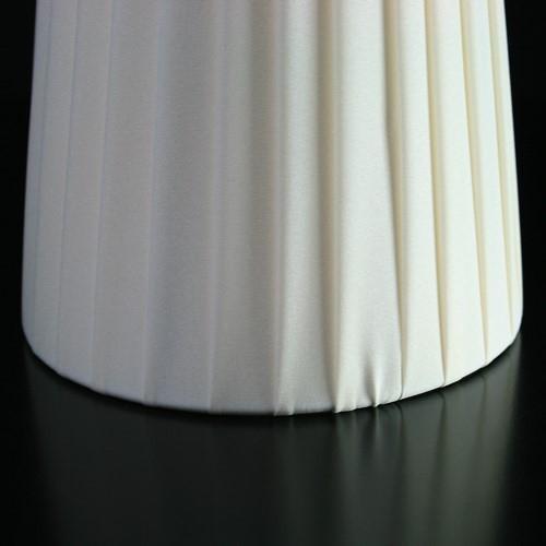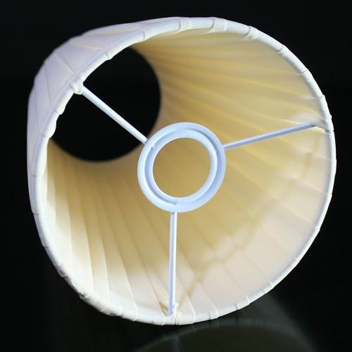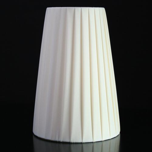 Paralume tronco cono con attacco standard E14. Il paralume è artigianale e ha telaio color bianco, rivestito in materiale seta pongè plissettato color avorio.