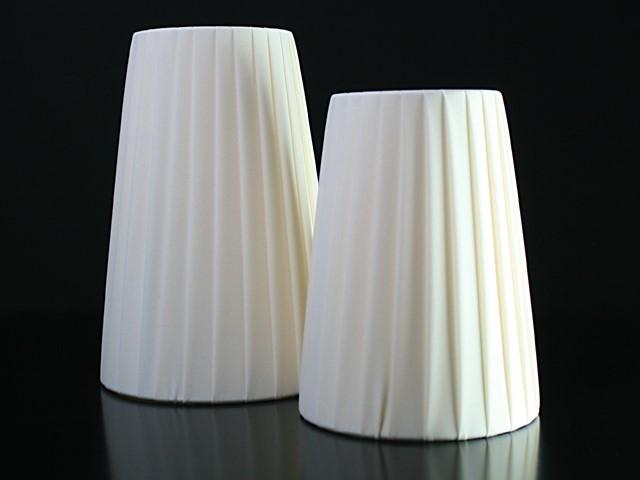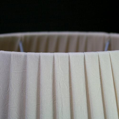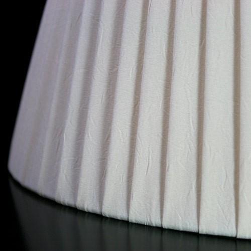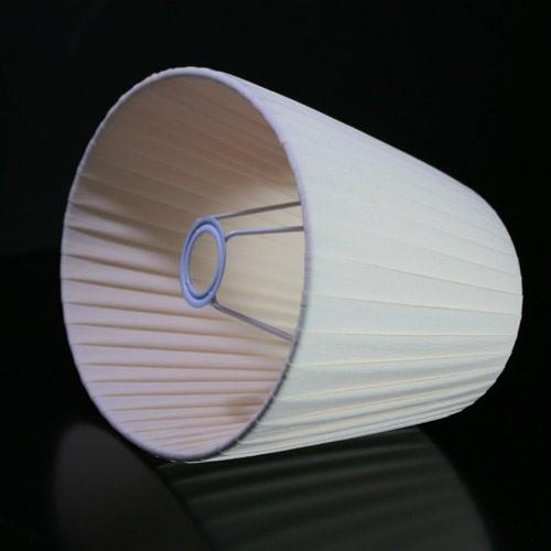 Paralume ovale tronco cono con attacco standard E14. Il paralume è artigianale e ha telaio color bianco, rivestito in materiale seta pongè plissettato color avorio.