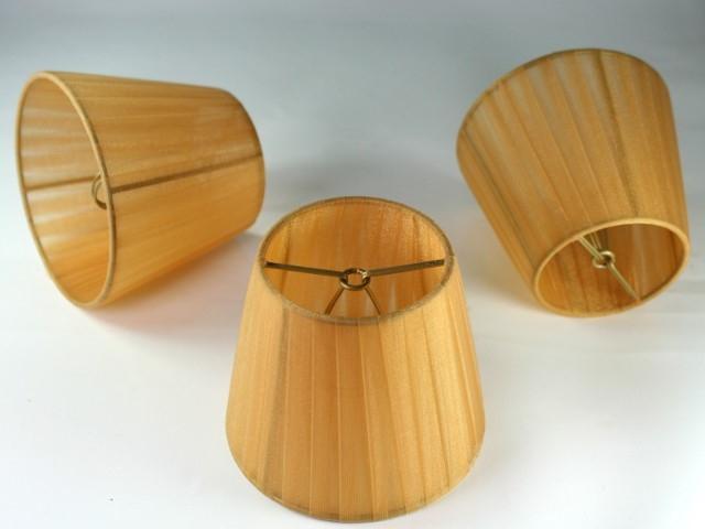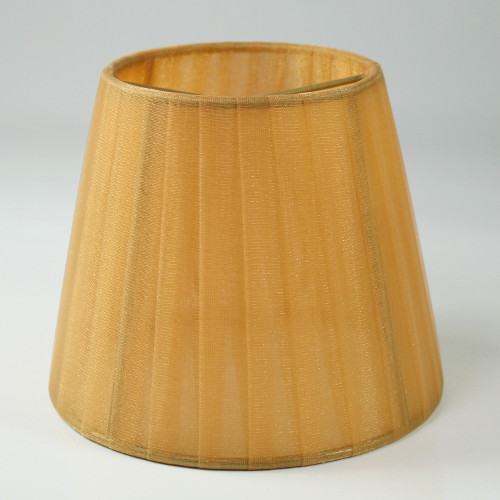 Paralume tronco conico rivestito da velo organza ambra chiaro, Ø12 Ø8 h10 cm. Montatura oro a molla.