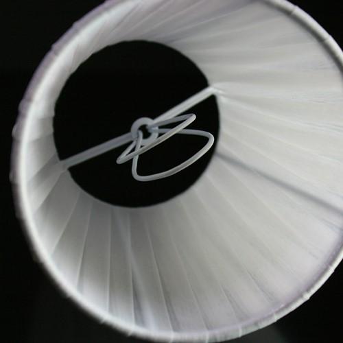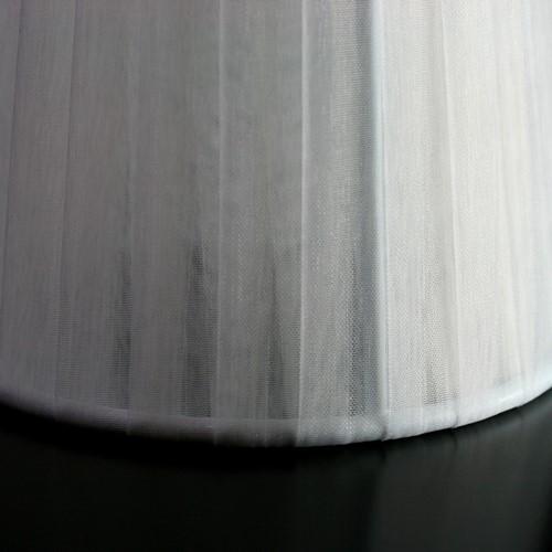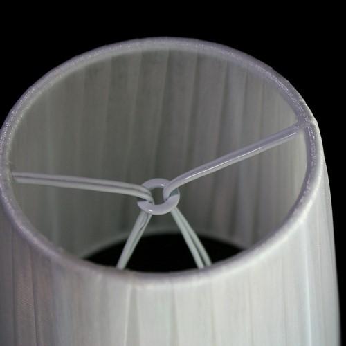 Paralume tronco cono con attacco universale a molletta. Il paralume è artigianale e ha telaio color bianco, rivestito in materiale Velo Siena (organza) nastrato color bianco.