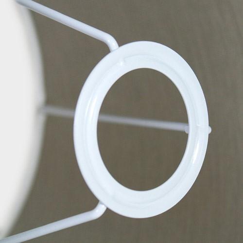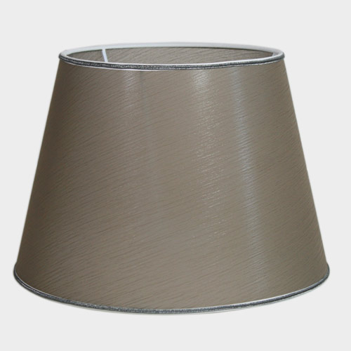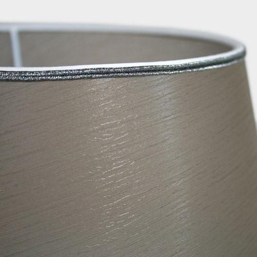 Il paralume è realizzato a mano, ed è ricoperto da un elegante tessuto color tortora, dall'effetto stropicciato; ad ulteriore rifinitura sono applicati, alla base e alla sommità del pezzo, due passamanerie di tipo "coda di topo".