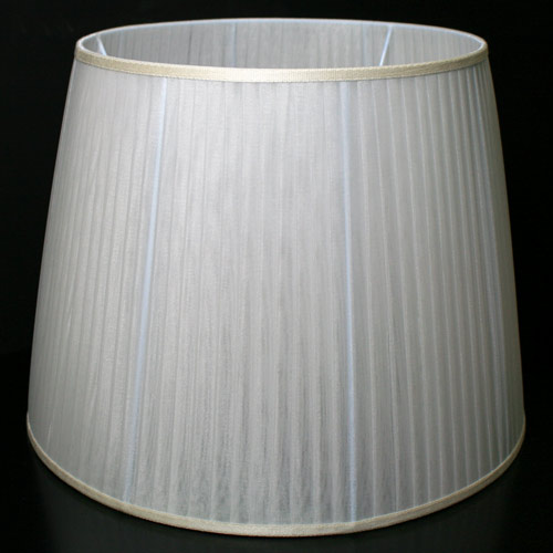 Paralume artigianale tronco cono con attacco standard E27. Il paralume ha telaio color bianco, rivestito in elegante materiale Velo Siena (organza) color bianco nastrato con bordura color avorio.