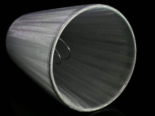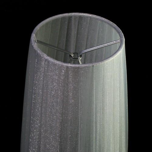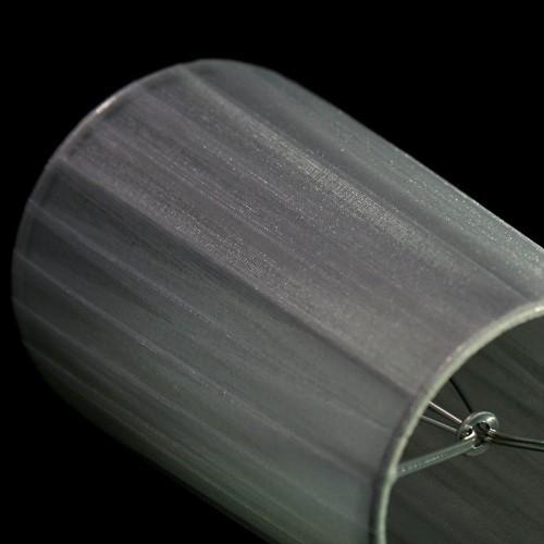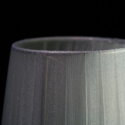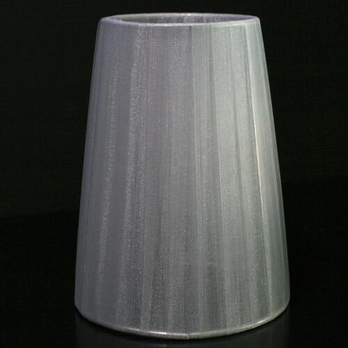 Paralume tronco cono con attacco universale a molletta. Il paralume è artigianale e ha telaio color argento, rivestito in materiale Velo Siena (organza) nastrato color grigio argento.