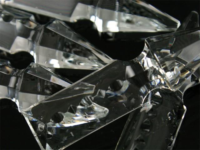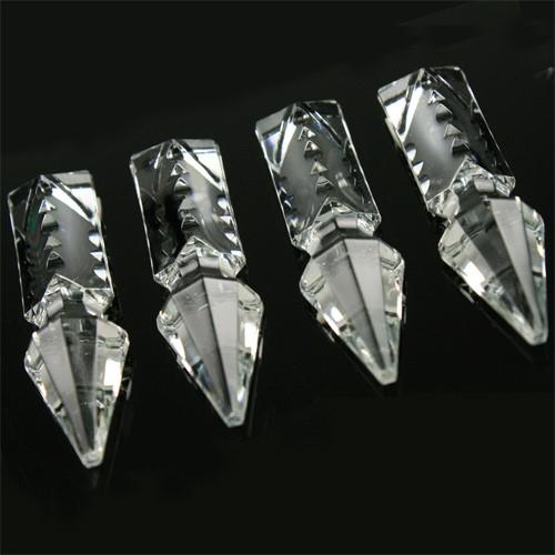 Losanga pendente, con forma a freccia in puro vetro veneziano color cristallo. Ogni pendente è forato in sommità per l'inserimento del relativo spillo o gancio. Pendenti di questo tipo sono utilizzabili come componenti per opere di luce, ma anche per decorazioni o confezioni, nonché per la realizzazione di sofisticati addobbi o di monili.