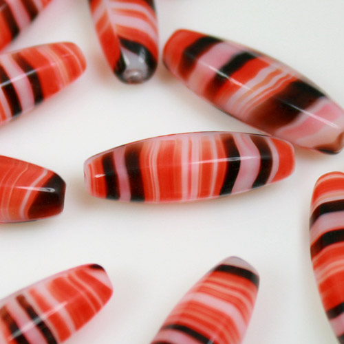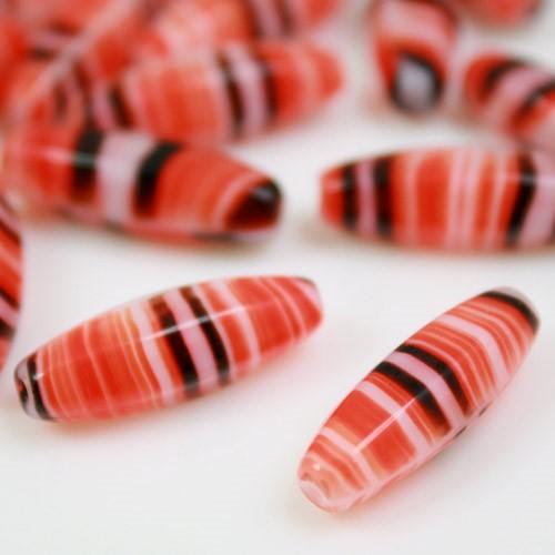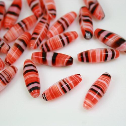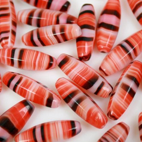 Perla allungata in pasta di vetro striata arancio, bianco e nero, 23 mm