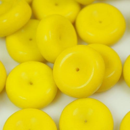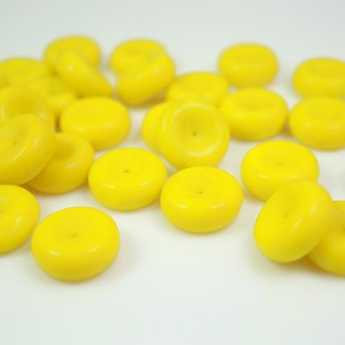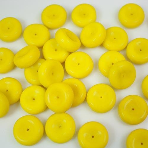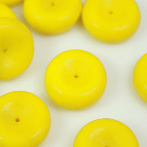 Perla a forma di ciambella, realizzata in pasta di vetro giallo. Ogni perla è dotata di un foro, di diametro 0.8 mm, misura rispettivamente 17 mm di larghezza e 7 mm di altezza. Tutte le perle sono simili, tuttavia è possibili riscontrare quanlche lieve differenza dovuta alla lavorazione artigianale, ciò non deve essere considerato come un difetto, ma come un sinonimo di unicità. Dal colore molto vivace, sono perle uniche anche per la loro forma a ciambella, insolita per la classica produzione di perle in vetro. Per produrre queste perle sono state impiegate tecniche artigianali antiche non più utilizzate. Perle perfette per la creazione di gioielli e monili unici, possono diventare un tratto distintivo nell'ambito dell'home decor, inoltre sono impiegabili per rendere speciali le vostre composizioni e le vostre confezioni regalo.