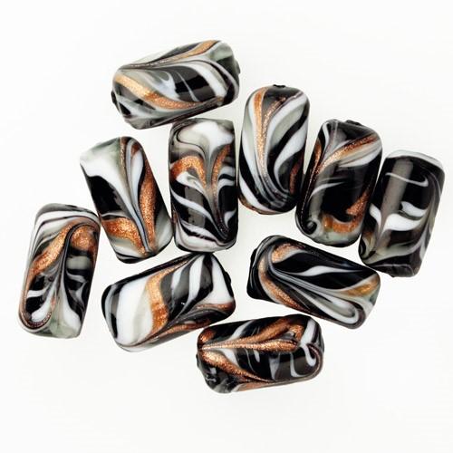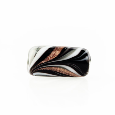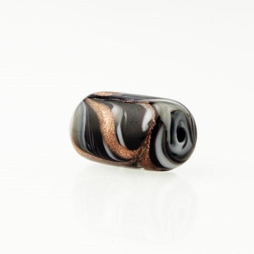 Perla di Murano cilindro Fenicio Ø9x18. Vetro bianco, nero e avventurina. Foro passante.