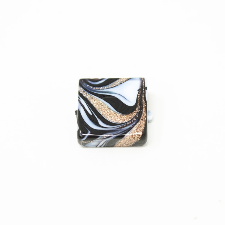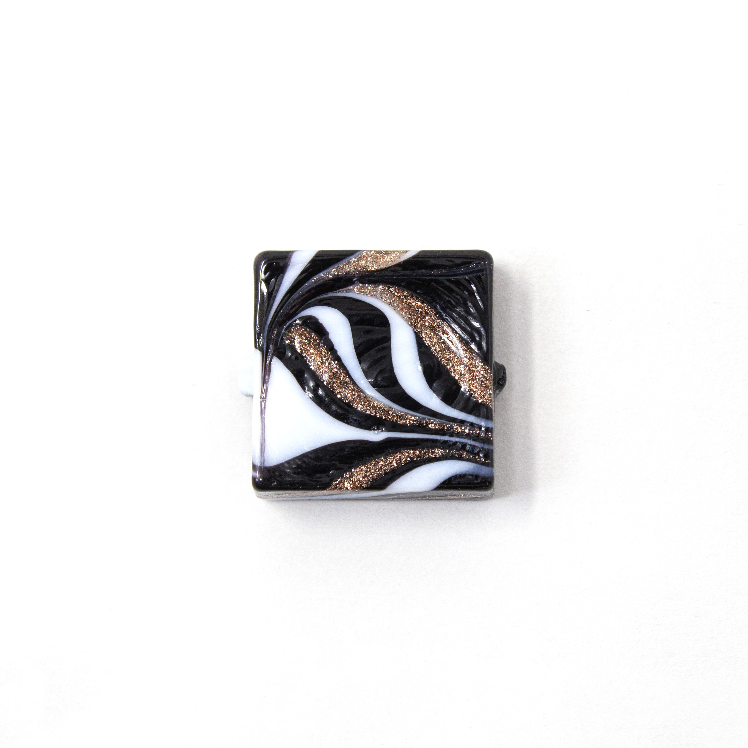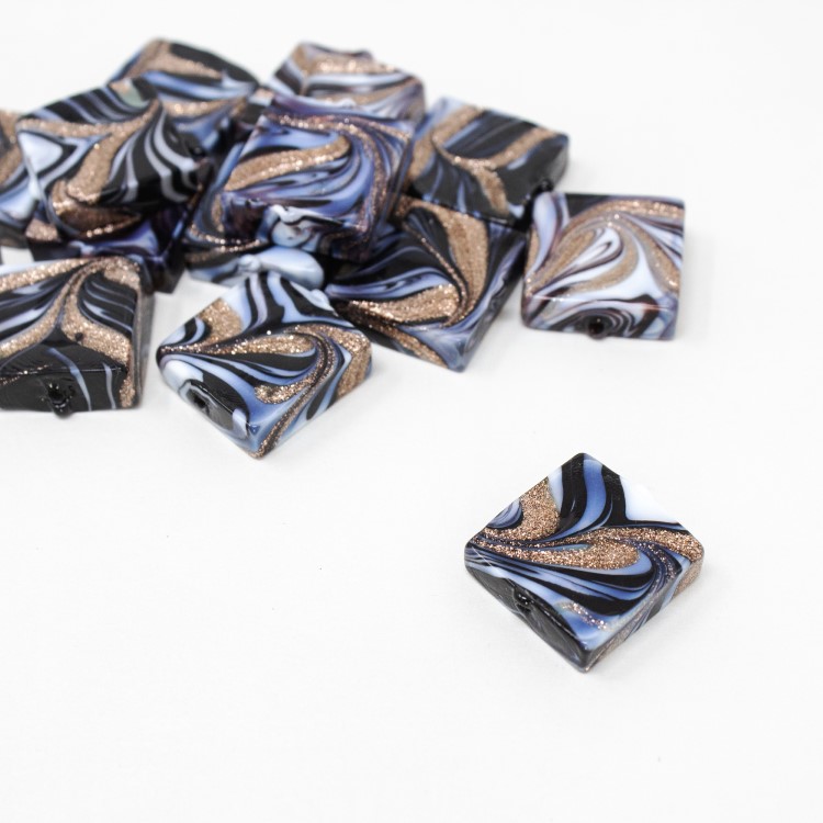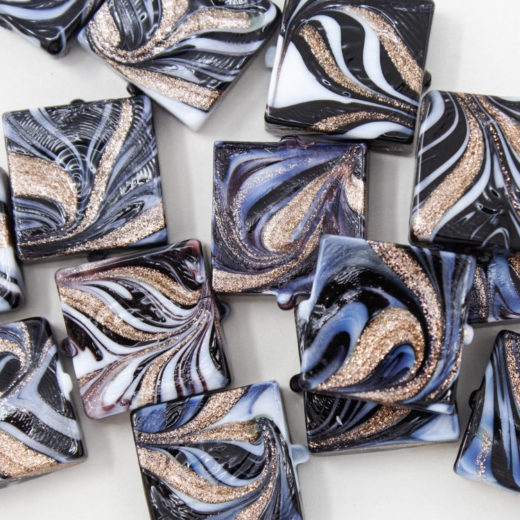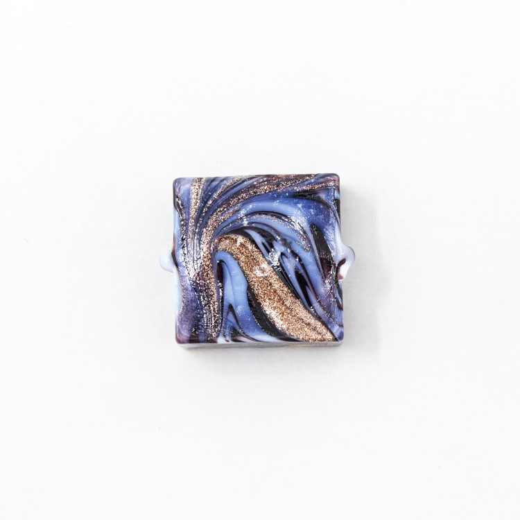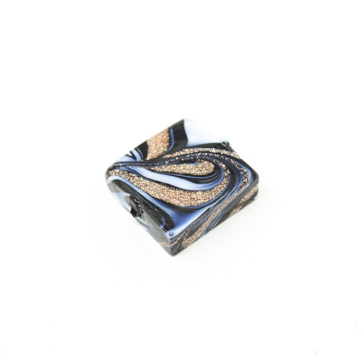 Perla di Murano é un prodotto manifatturiero locale, qui ne é d'esempio questa perla quadrata in vetro nero e avventurina, con foro passante. La particolare decorazione detta “Fenicio” per la sua striatura multicolor, dona movimento e vivacità al colore, aspetto tipico del vetro artistico veneziano. La sua forma permette di ottenere diversi effetti, ottenendo oggetti d'alta bigiotteria artigianale. Non è solo un hobby, ma un'attività propria della nostra tradizione.