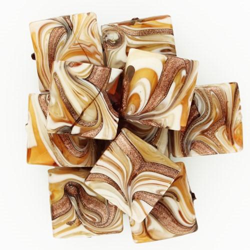 Perla di forma quadrata  realizzata con la particolare tecnica del disegno "Fenicio" nei toni dell'ambra, dell'avorio e del topazio; é munita inoltre di avventurina preziosa. La perla ha diametro di [Ø18x18 mm] ed è dotata di foro passante. Come tutte le nostre proposte in questa sezione, la perla è fatta a mano da artigiani veneziani e rigorosamente made in Venice. I nostri prodotti sono destinati a creazioni di bigiotteria di alta qualità. Collane, bracciali, orecchini d'alta moda per uno stile unico ed inimitabile. Ordina ciò che ti piace!