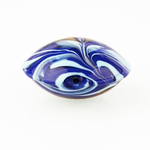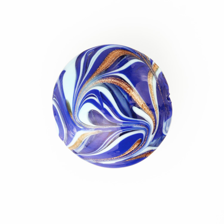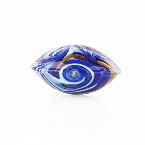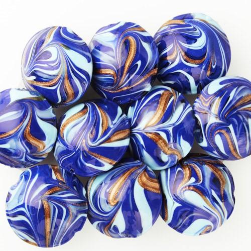 Perla di Murano schissa Fenicio Ø30. Vetro blu lapis, azzurro e avventurina. Foro passante.