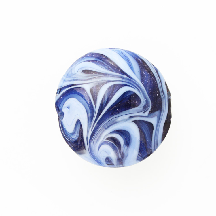 Perla di Murano schissa Fenicio Ø30. Vetro pervinca, lapis e avventurina blu. Foro passante.