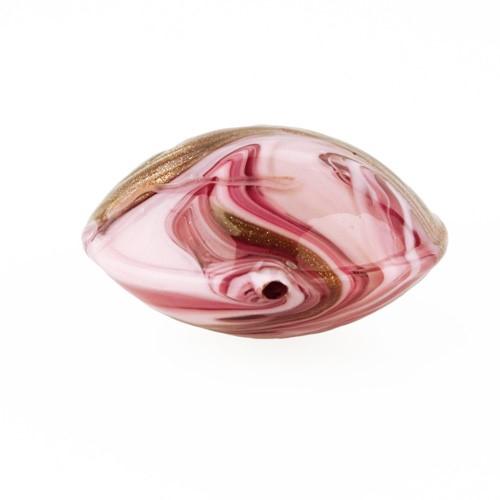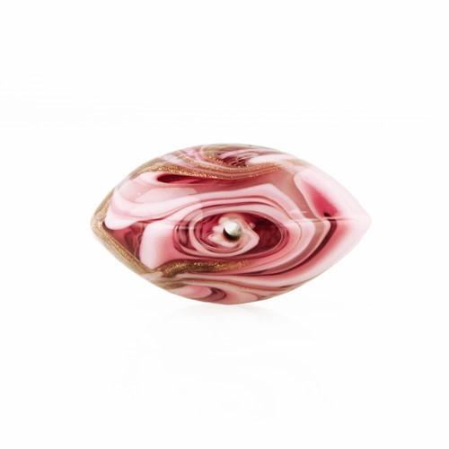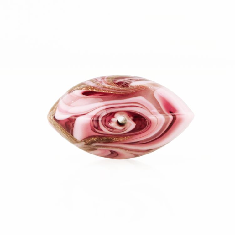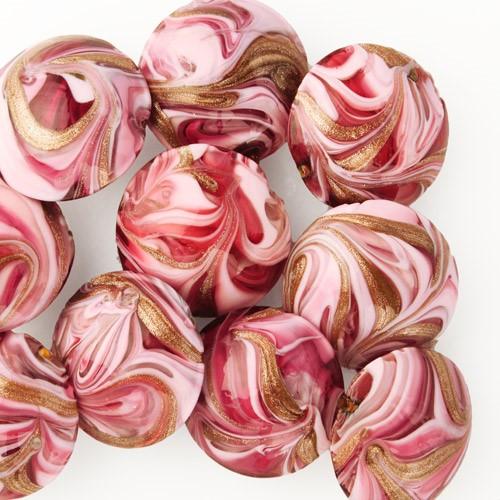 Queste perle veneziane sono rigorosamente lavorate a mano. Misurano Ø30x30 mm, in vetro rubino, rosa e avventurina; di forma schiacciata(detta "Schissa" dai muranesi). Presentano il caratteristico disegno a spirale detto “Fenicio”, costituito da strisce multicolor. Esse son frutto di un'attenta lavorazione ottenuta da più stratificazioni in vetro, che ne determinano la preziosità. L'artigianalità è alla base della creazione del prodotto lavorato a lume, dalla rifinitura lucida che apporta ulteriore pregio all'articolo.