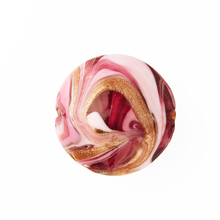 Perla di Murano schissa Fenicio Ø30. Vetro rubino e avventurina. Foro passante.