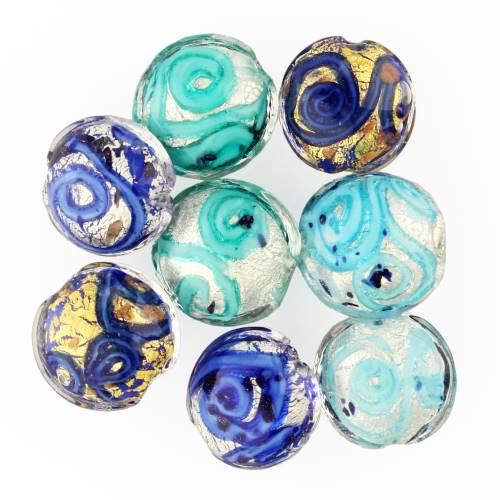 Le perle a lume sono oggetti di elevatissimo prestigio per la tradizione muranese. Qui vi presentiamo perle in vetro turchese, foglia argento e avventurina. Questa perla viene chiamata "Schissa" dai Maestri vetrai: definizione della forma schiacciata. La decorazione esprime tutta l' autenticità della perla: i colori sono brillanti e gioiosi, adatti per una serata mondana all'insegna dello stile. Scopri tutte le nuance.