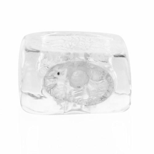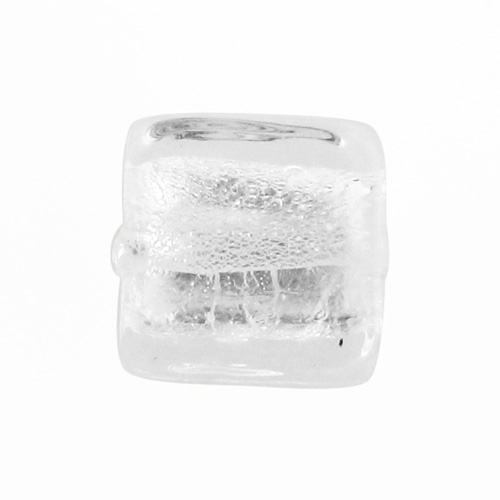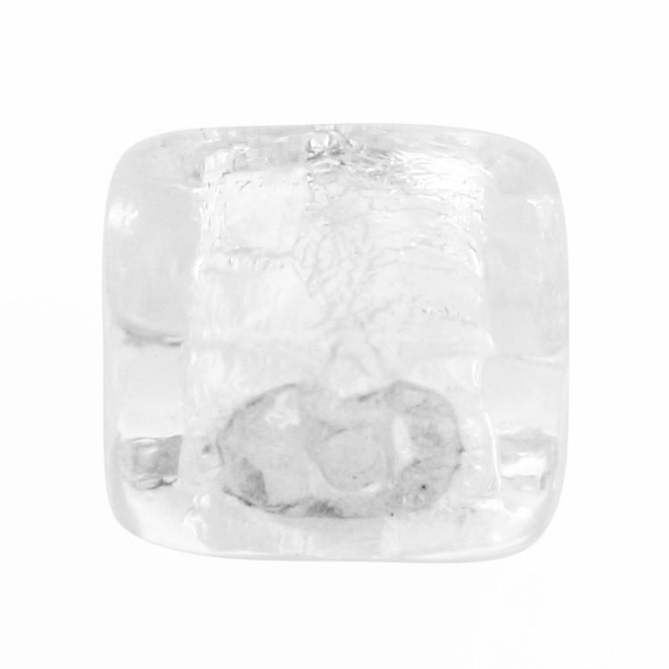 Perla di Murano schissa quadrata Ø12. Vetro sommerso trasparente, foglia argento. Foro passante.