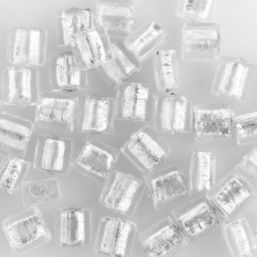 Perla veneziana caratterizzata da varie gamme cromatiche. Questo prodotto ve lo proponiamo in vetrotrasparente, impreziosito dalla lucente foglia argento. Misure [Ø12x12 mm] e forma quadrata, con foro passante per creazione di gioielli. La lucentezza è data dall'abbinamento tra il vetro e la foglia argento, due materiali che permettono di ottenere effetti sorprendentemente brillanti e vistosi. Perle in vetro di Murano di alta qualità "made in Italy", fatte a lume secondo la tradizione degli antichi gioielli dell'arte veneziana. Un mix di colore e forme ideale per la creazione di collane artigianali e il fai da te creativo.