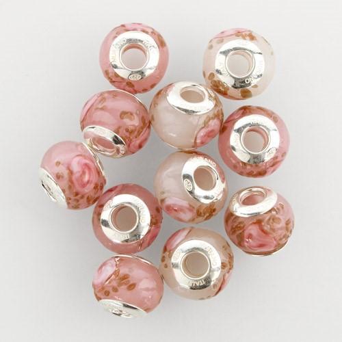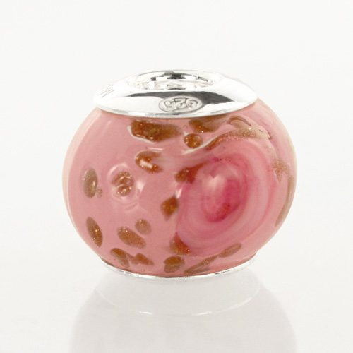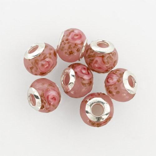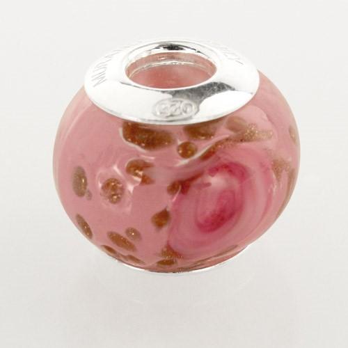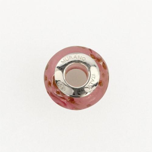 Perla di Murano stile Pandora Boccioli di rosa Ø13. Vetro rosa e avventurina. Borchia argento 925. Foro passante.