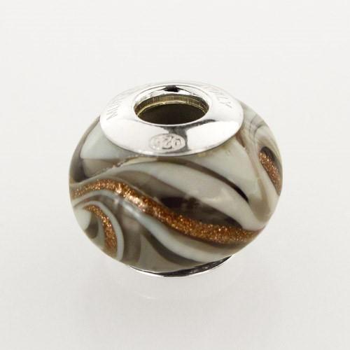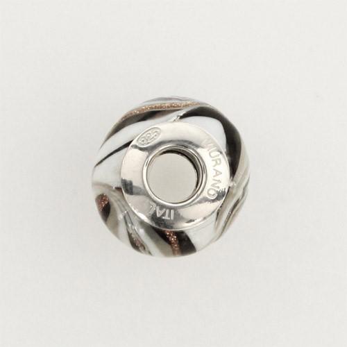 Perla di Murano stile Pandora Fenicio Ø13. Vetro bianco, grigio e avventurina. Borchia argento 925. Foro passante.