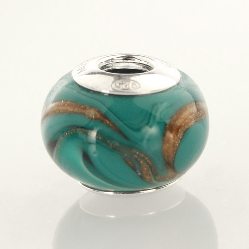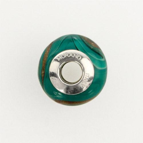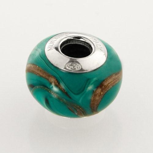Perla di Murano stile Pandora Fenicio Ø13. Vetro verde chiaro, verde acqua, verde scuro e avventurina. Borchia argento 925. Foro passante.