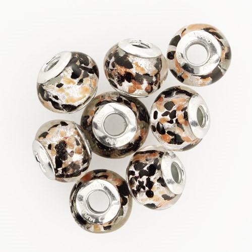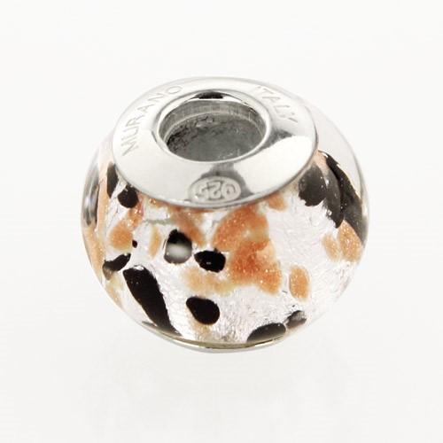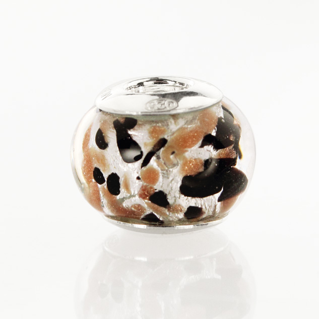 Perla di Murano stile Pandora Graniglia Ø13. Vetro nero, avventurina, foglia argento. Borchia argento 925. Foro passante.