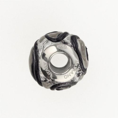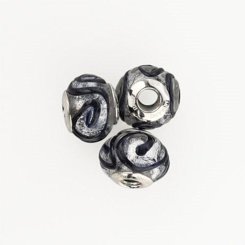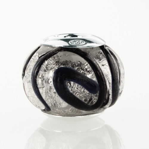 Perla di Murano stile Pandora Vortice Ø13. Vetro trasparente, avventurina blu e foglia argento. Borchia argento 925. Foro passante.