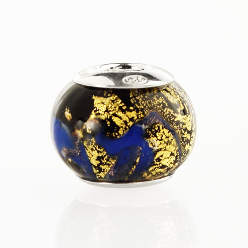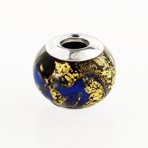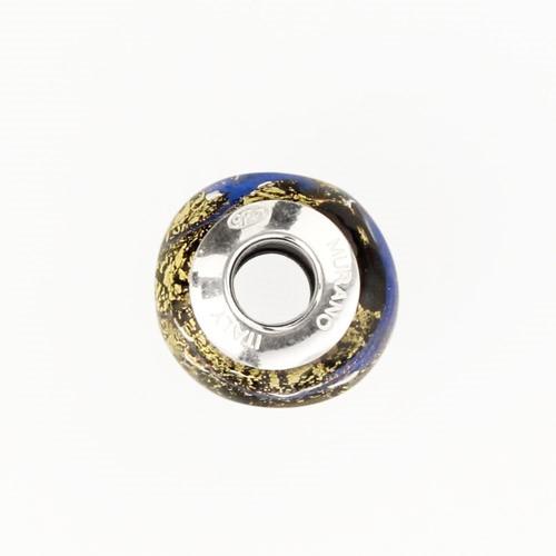 Perla di Murano stile Pandora Sommersa Ø13. Vetro blu, foglia oro. Borchia argento 925. Foro passante.