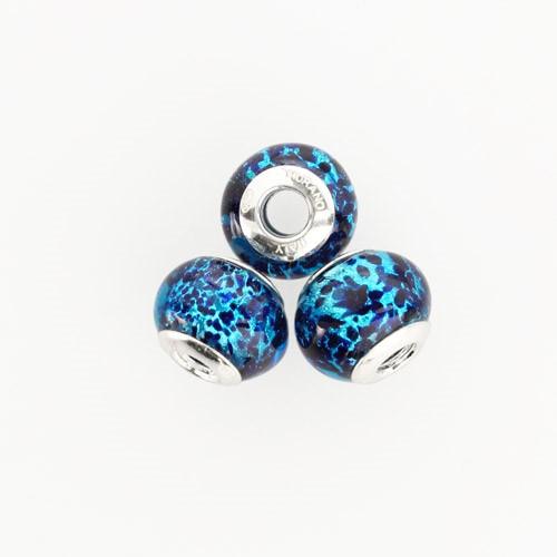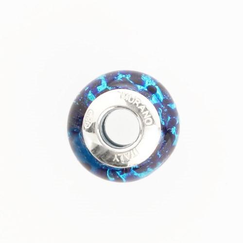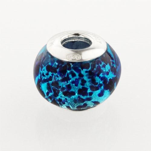 Perla di Murano stile Pandora Sommersa Ø13. Vetro turchese, avventurina blu, foglia argento. Borchia argento 925. Foro passante.