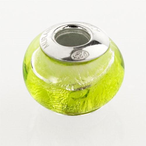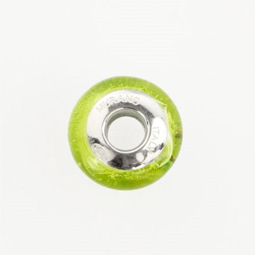 Perla di Murano stile Pandora Bicolore Ø13. Vetro verde chiaro, foglia argento. Borchia argento 925. Foro passante.