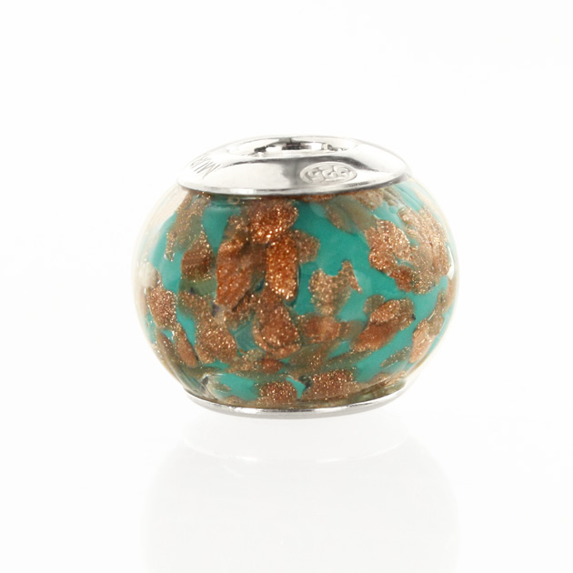Perla di Murano stile Pandora Sommersa Ø13. Vetro verde e avventurina. Borchia argento 925. Foro passante.