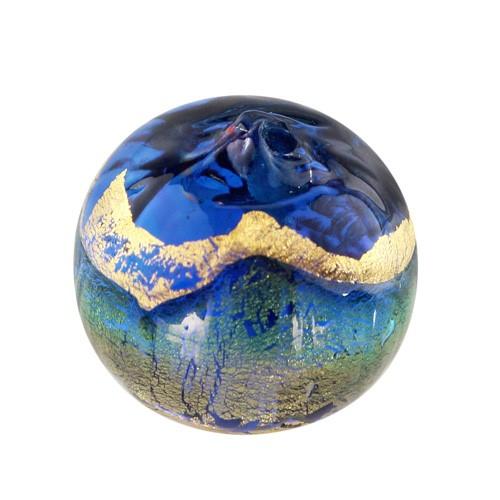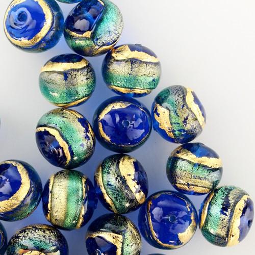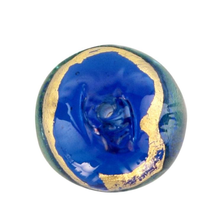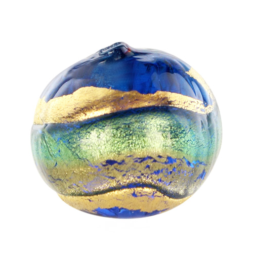 Perla di Murano tonda Sommersa Ø14. Vetro acquamare, bluino, foglia oro. Foro passante.