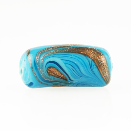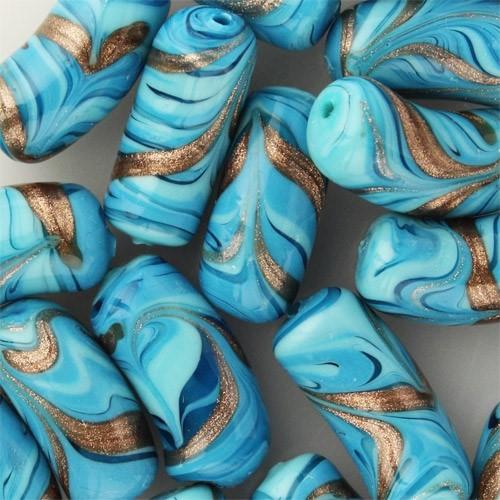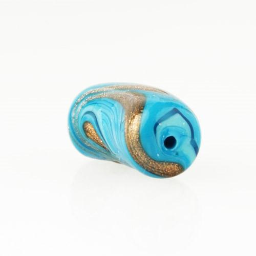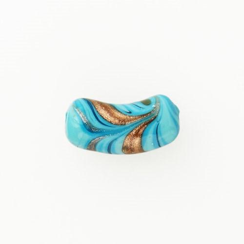 Perla di Murano tubo curvo Fenicio Ø9x23. Vetro bianco, turchese e avventurina. Foro passante.