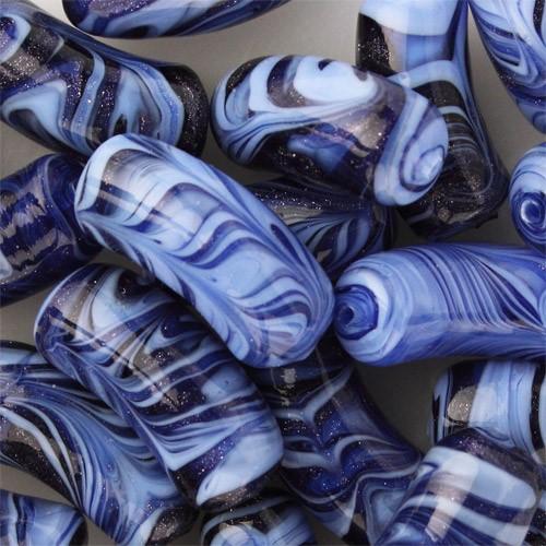 Perla veneziana  di alto valore manifatturiero fatto in Italia, caratterizzata da un vortice di colori con vetro pervinca, lapis e avventurina blu. Misura Ø9x23 mm e forma curva, con foro passante per creazione di gioielli. Perle in vetro di Murano di alta qualità, fatte a lume secondo la tradizione di questi antichi gioielli dell'arte veneziana delle perle. Un mix di colore e forme ideale per la creazione di collane artigianali e il fai da te creativo.